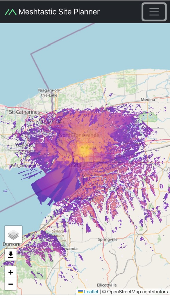 We’re excited to announce the newest addition to the BuffaLoRa community network: the deployment of a Meshtastic node — short name KMBL — at the Buffalo Amateur Radio Repeater Association (BARRA) Kimball Tower Repeater Site on August 13th, 2025. This site provides an excellent vantage point within the Western New York region with clear views spanning West from Orchard Park in the South across the City of Buffalo to Tonawanda in the North and beyond.